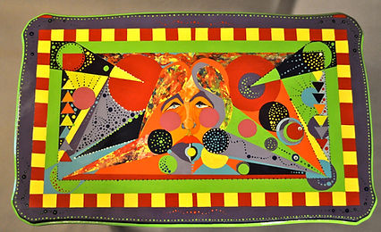 The graphic lady table has an image of a lady as part of the graphic design. This table is 25.5 inches by 15 inches and is 17 inches in height. The design is painted in bright acrylics and finished with a polyeitherane finish.