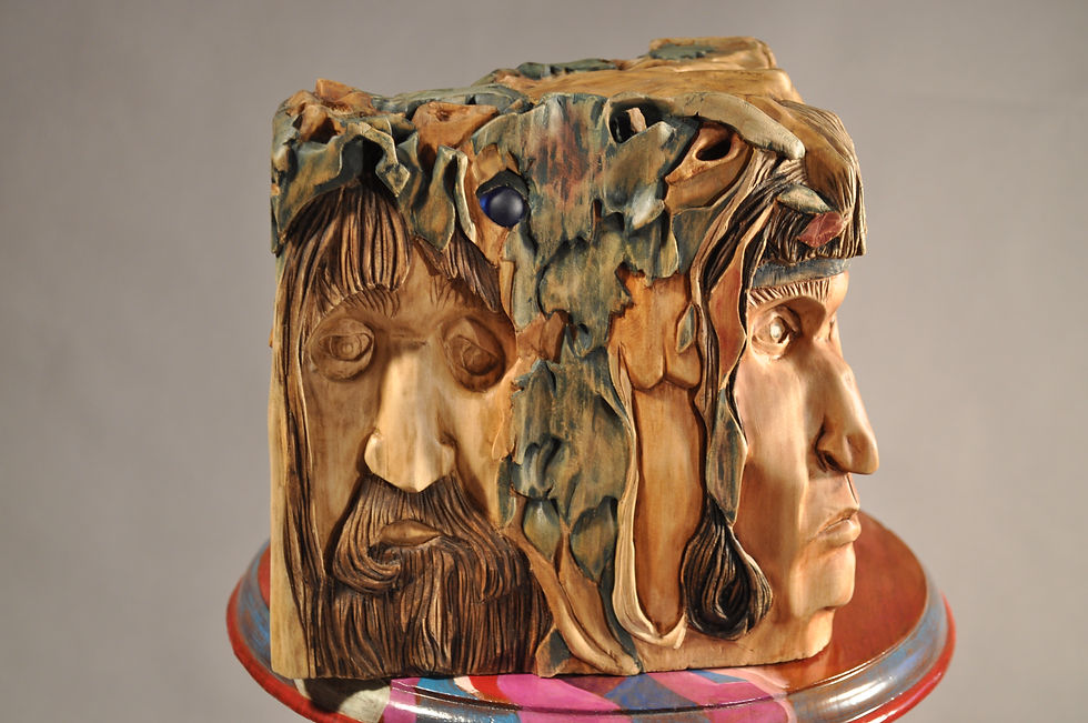 The Wood Spirits carving has four carved sides to include the top of the carving, which has a hand reaching into one of the carved faces. The wood is bass wood and the carving has some slight painted surfaces to highlight different aspects and areas of the carving.